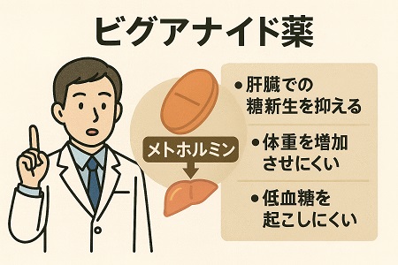 - ・主な作用:糖新生抑制 特徴:インスリンの効きを良くして血糖値を下げる。肝臓から糖が放出されるのを抑制し、インスリンに対する感受性を向上させる。また低血糖を起こしにくく、体重増加が抑えられる