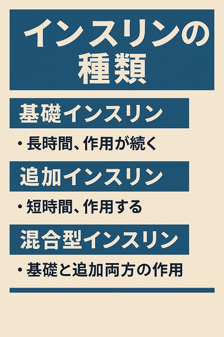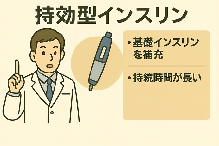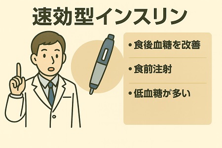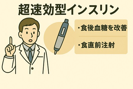 超速効型・速効型::食直前・食前に注射し、インスリンの追加分泌を補うことで食後の急激な血糖値上昇を抑えます。