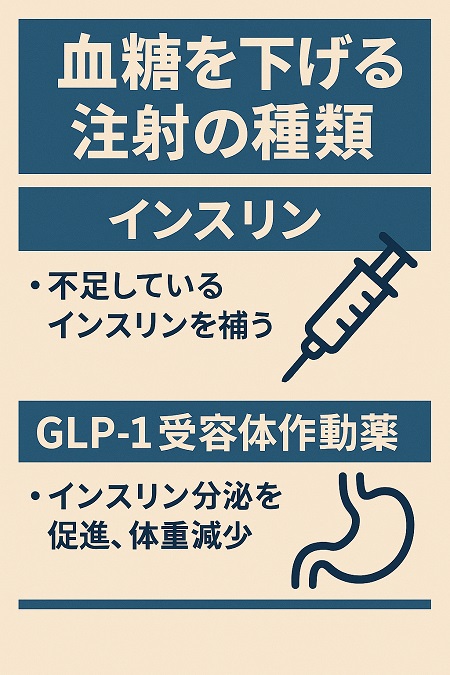 血糖値を下げる注射薬はインスリンとGLP-1作動薬・GIP/GLP-1受容体作動薬があります