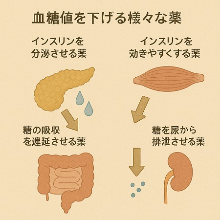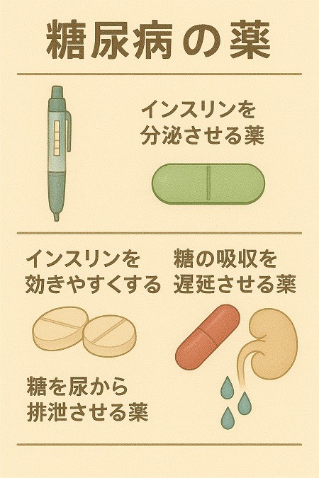 血糖値を下げる方法としてインスリンを出しやすくする薬とインスリンを効きやすくする薬、糖の吸収・排泄を調整する薬の3タイプにわけられます。