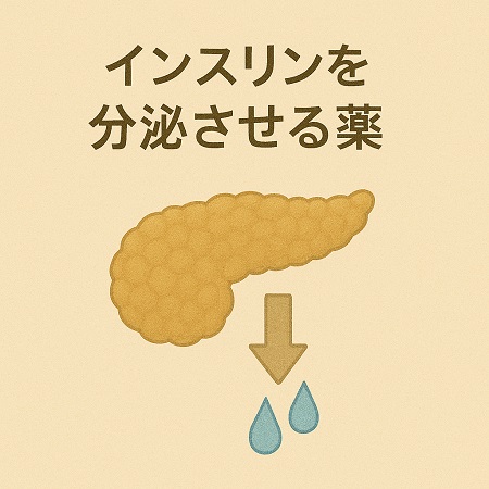 - ・主な作用:インスリン分泌促進 特徴:膵臓のβ細胞に働きかけ、インスリンの分泌を促す。血糖とは関係なくインスリン分泌が促進されるため、低血糖になりやすい点に注意が必要
