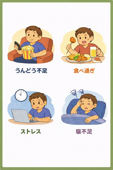 糖尿病予備軍(境界型)は遺伝しやすい傾向があります。両親どちらかが糖尿病なら発症リスクは3〜4倍高まります。また遺伝だけでなく生活スタイル・食生活や嗜好品、運動習慣(運動不足)などの生活習慣(環境因子)も大きく影響します。 生活習慣要因だと過食、運動不足、ストレス、睡眠不足、喫煙、飲酒などが原因でインスリン分泌不足やインスリンの効きが悪くなる(インスリン抵抗性)なり血糖値が高い状態(境界型)になります。