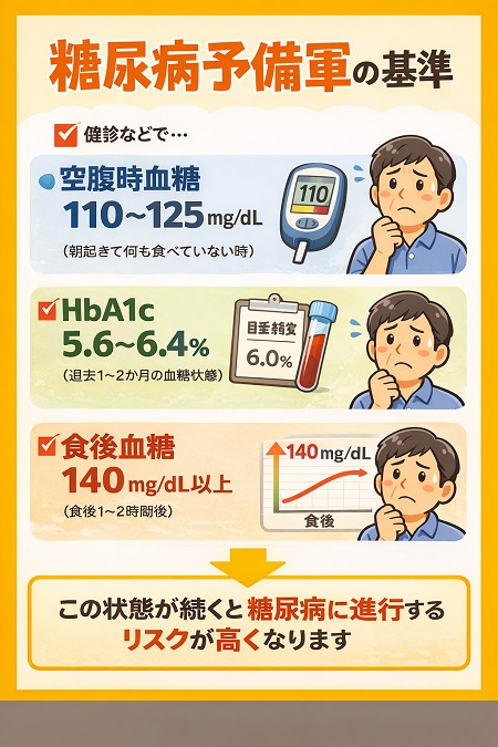 糖尿病予備軍(境界型)の診断基準は、空腹時血糖値が110〜125mg/dL、または食後2時間血糖値(75g経口ブドウ糖負荷試験(75gOGTT))が140〜199mg/dL、HbA1c(NGSP)が6.0%以上です。