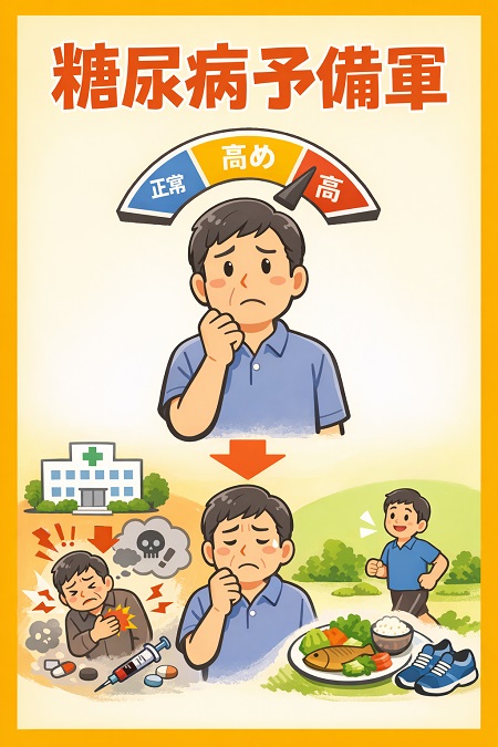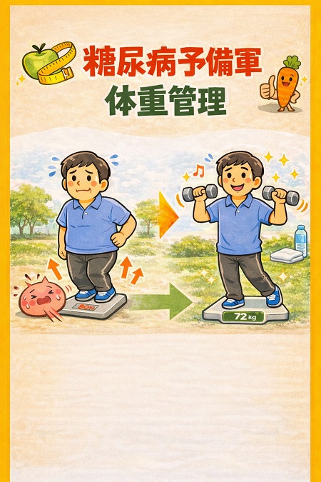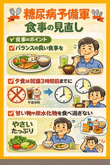 体重増加が原因で糖尿病予備軍(境界型)といわれたら減量する事が重要です。 糖尿病予備軍の減量は、適正体重の維持、食事内容の見直し(糖質・脂質・塩分控えめ、食物繊維・タンパク質を意識)、運動習慣の見直し(有酸素運動中心)を中心に、無理なく続けることがポイントです。