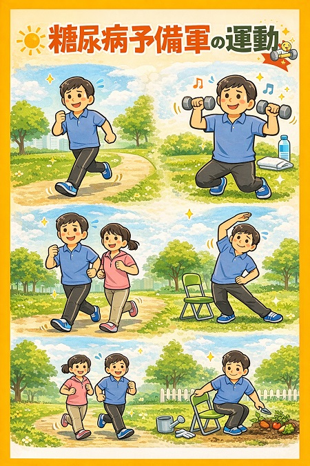 糖尿病予備軍(境界型)といわれたら運動習慣の見直しましょう。運動習慣の見直しとしては血糖値が上昇する食後1時間〜2時間後(血糖値スパイク)に10〜30分程度の「ウォーキング」や「スクワット」などの有酸素運動・筋トレが効果的です。 運動療法は食事療法と並んで重要な治療になります。筋肉を減らさず脂肪を減らし、健康的な体質改善をするとともに、カロリーを消費する事で直接的に血糖を下げることが重要です。また、運動によりインスリンの働きが良くなるといったメリットもあります。しかし、急な激しい運動は、病状によっては合併症を悪化させる場合もあるため、医師の判断による運動処方が必要です。