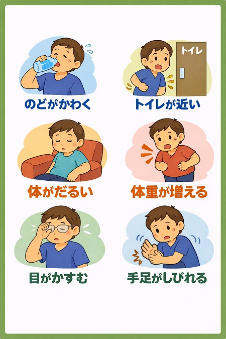 糖尿病予備軍の症状としては、「倦怠感やだるさ」「体重が増えた」「いつも通り食べても痩せる」「のどの渇き、多飲、多尿」「食べてもすぐにお腹が空く」「手足のしびれ」「目がかすむ」「傷が治りにくい」「手足の冷え」「手足の痺れ」「尿が匂う・尿が泡立つ・尿に血が混じる」などのサインが見られます。