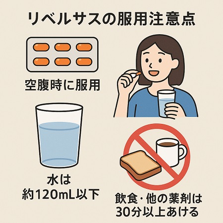 リベルサスは空腹時にコップ約半分の水(約120mL以下)で服用します。また服用時および服用後30分間は、飲食や他の薬剤の経口摂取を避ける必要があります。多すぎる水で飲むと薬が薄まり、吸収効率が低下する可能性があります。