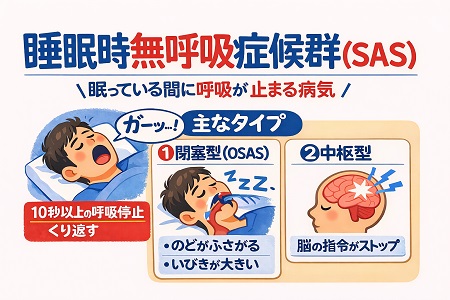 睡眠時無呼吸症候群(SAS)は、高血圧や心血管疾患などの合併症を引き起こすリスクも高まるため、早期の診断と治療が重要です。