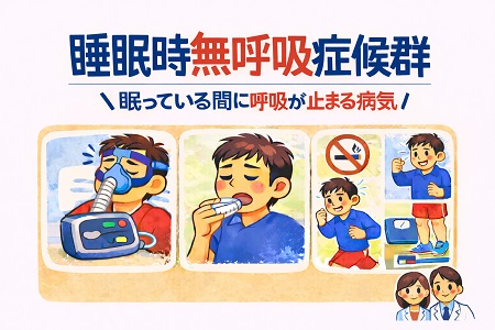 扁桃肥大・アデノイド肥大や、下顎が小さかったり、肥満症、花粉症やアレルギー性鼻炎で副鼻腔炎(蓄膿症)が原因で睡眠時無呼吸症候群を発症します。 睡眠時や日常で陥没呼吸、寝汗、夜尿、夜中に何度も起きる、食事に時間がかかる、口呼吸、寝相が悪い、落ち着きがない、勉強に集中できない、イライラしやすい、攻撃的動作や粗暴などの症状が見られたら、睡眠時無呼吸症候群が疑われますので、医療機関にご相談ください。