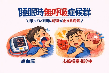 睡眠時に呼吸が止まると酸素が取り込めなくなることなどから、高血圧、不整脈、心不全、脳卒中などのリスクが高まります。